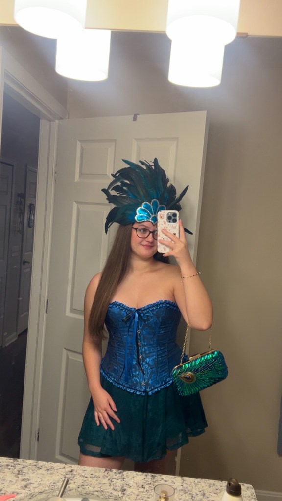 After a while of scrolling, I finally found a costume idea that sounded fun: a peacock. I started searching on Amazon for anything that could work for the costume that would also arrive in time. Unfortunately, most of the more peacock-specific accessories would not arrive in time, but I was able to find a few things I thought might work. I ended up ordering a blue corset, a green skirt, a teal feather headpiece, some peacock feathers, and a small purse with a beaded peacock feather design.